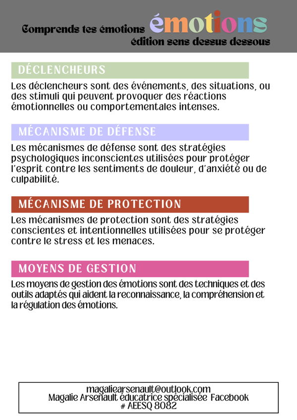 Procurrez vous l'outil des fiches sens dessus dessous (gratuitement) afin de compléter l'outil. Dans cet outil complémentaire, chacune des émotions a sa fiche descriptive, afin d’identifier son utilité, ses attributs, ses manifestations, ses besoins et ce qui est observé lorsque cette émotion prend trop de place. Bien évidement, comme les autres sections de l’outil, il est possible d’ajouter d’autres éléments (en fonction du jeune). L’outil est complet et adresse les éléments les plus observés.