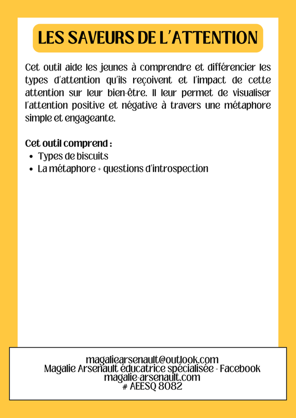 Cet outil aide les jeunes à comprendre et différencier les types d’attention qu’ils reçoivent et l’impact de cette attention sur leur bien-être. Il leur permet de visualiser l’attention positive et négative à travers une métaphore simple et engageante.