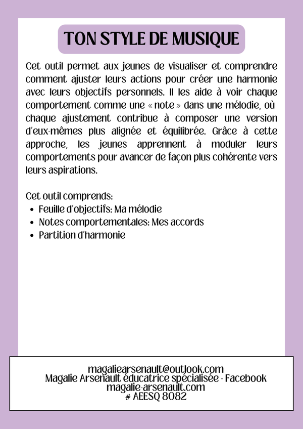 Cet outil permet aux jeunes de visualiser et comprendre comment ajuster leurs actions pour créer une harmonie avec leurs objectifs personnels. Il les aide à voir chaque comportement comme une « note » dans une mélodie, où chaque ajustement contribue à composer une version d’eux-mêmes plus alignée et équilibrée. Grâce à cette approche, les jeunes apprennent à moduler leurs comportements pour avancer de façon plus cohérente vers leurs aspirations.