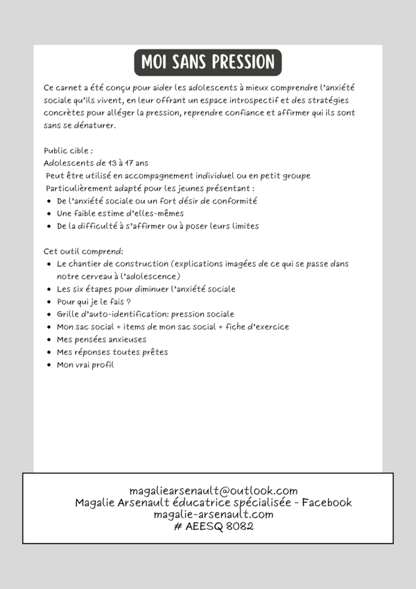 Ce carnet a été conçu pour aider les adolescents à mieux comprendre l’anxiété sociale qu’ils vivent, en leur offrant un espace introspectif et des stratégies concrètes pour alléger la pression, reprendre confiance et affirmer qui ils sont sans se dénaturer.